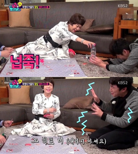 장동민은 김수미 앞에 무릎을 꿇고 넙죽 엎드리며 물을 대령(?)했다.