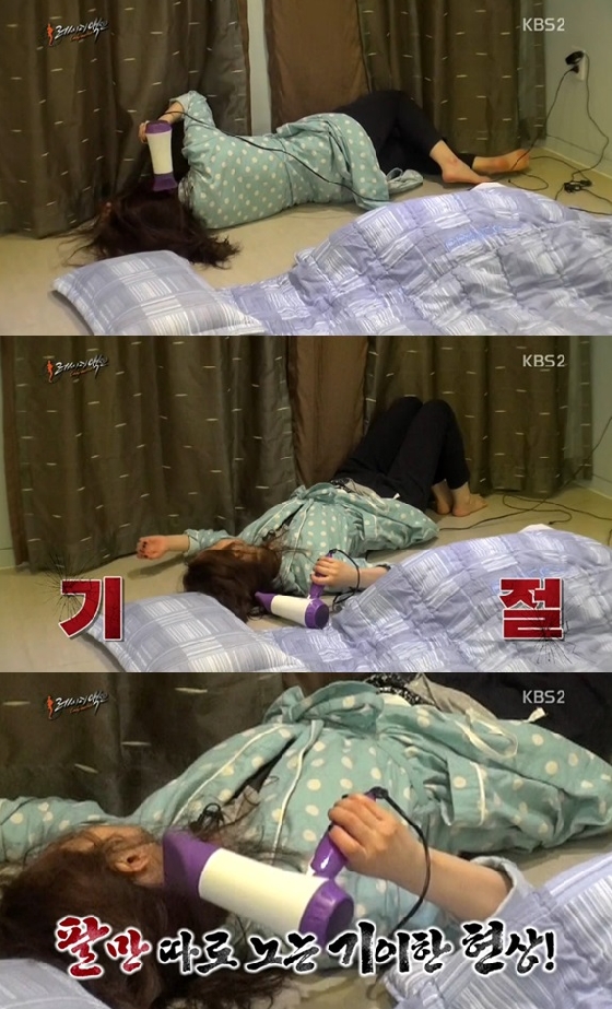 김현주는 헤어 드라이어를 켜놓은 채 꼼짝을 않다가 다시 손을 움직이며 머리를 말려 웃음을 자아냈다.