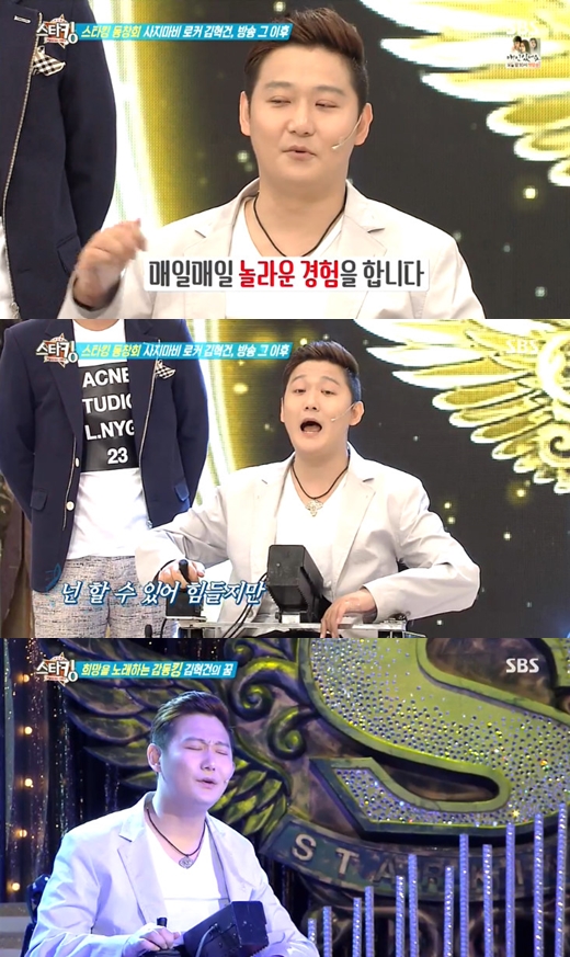 22일 오후 방송된 SBS 예능프로그램 '놀라운 대회-스타킹'(이하 '스타킹')에서는 그동안 스타킹이 배출한 스타들이 총출동해 무대를 장식했다. 이날 방송에는 더 크로스 김혁건 씨가 출연했다.