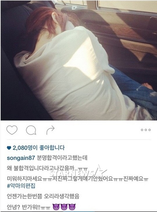 4일 가인은 자신의 인스타그램에 몸을 웅크린 채 뒤돌아 있는 사진과 함께 "분명 합격이라고 했는데 왜 '불합격입니다'로 나갔을까. 미워하지 마세요. 저 진짜 그렇게 얘기 안했어요. 진짜예요"라는 글을 게재했다. '악마의 편집' 해시태그(hash tag)를 빼먹지 않았다.