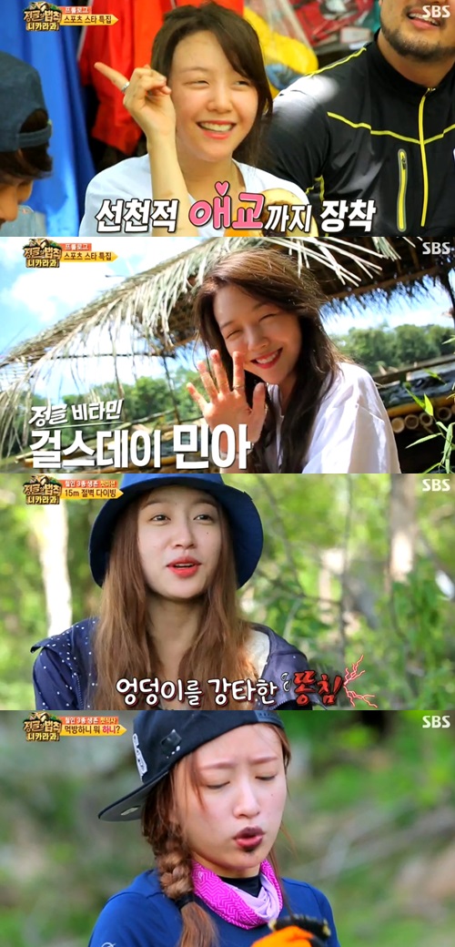 민아는 후반부 출연을 예고했지만 시종일관 민낯으로 생존을 이어가고 병만족 앞에서 걸스데이 '썸씽', '달링'을 부르는 모습이 공개돼 비타민 같은 활약을 예고했다.