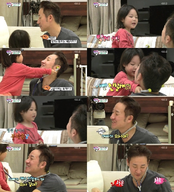 이에 엄지온은 "발레해"라고 답했다. 이후 엄태웅은 다시 "아빠는 뭐해?"라는 질문에는 "진찰해"라고 말했다. 평소 아빠와 병원 놀이를 해서 아빠가 의사라고 생각하는 듯 했다.