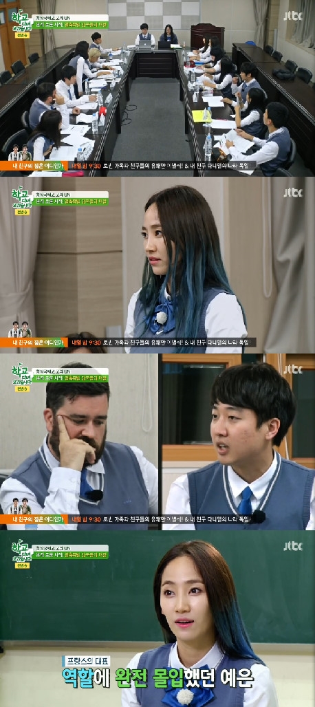 3일 오후 방송된 종합편성채널 JTBC 예능프로그램 '학교다녀오겠습니다(이하 '학교')' 마지막회에서는 청심국제고등학교를 찾은 스타들의 모습이 그려졌다. 이날 방송에서는 모의UN 회의를 개최하는 학생들의 모습이 그려졌다.