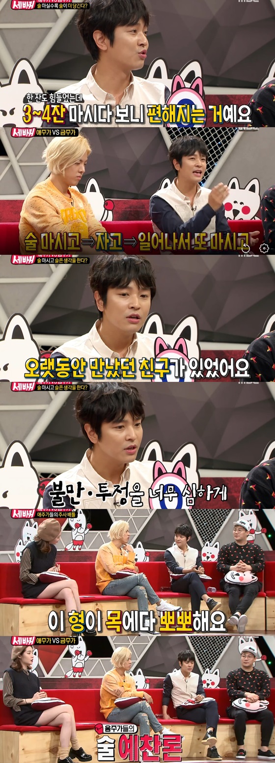 6일 오후 마지막 방송된 MBC '김구라 신동엽의 세바퀴'(이하 '세바퀴')는 '애주가VS금주가' 특집으로 꾸며져 윤민수, 김정훈, 이지현, 강남, 서유리, 이상준, 김새롬, 이정이 게스트로 출연했다.