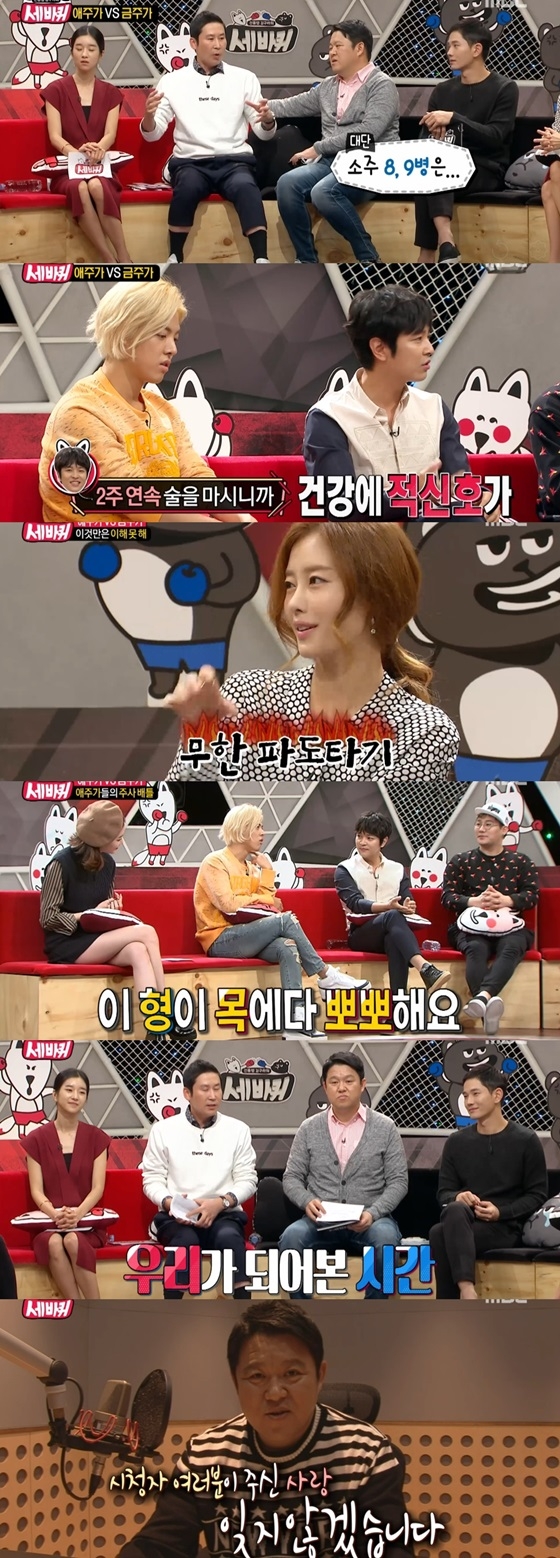 이날 '세바퀴' 마지막 방송에서는 '애주가VS금주가' 특집으로 꾸며져 윤민수, 김정훈, 이지현, 강남, 서유리, 이상준, 김새롬, 이정이 게스트로 출연했다.