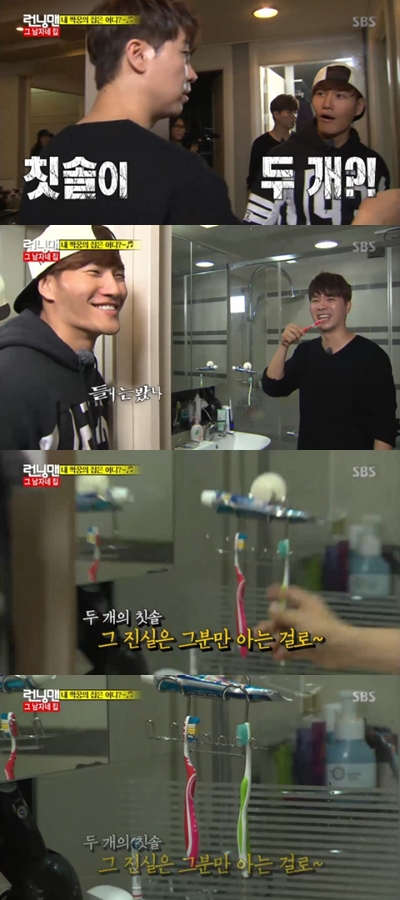 '런닝맨'의 김종국이 개그맨 박수홍의 집에서 칫솔이 두 개인 것을 보고 숨겨 놓은 여자친구가 있다고 의심했다.