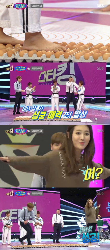 유라는 날달걀 위를 한발씩 내딛으며 걸었다. 그러나 단 하나도 깨지지 않으며 성공했다. 유라 본인도 "이게 뭐지"라며 놀라워했다. 유라의 성공을 본 '미녀 삼총사'는 당황한 기색이 역력했다.