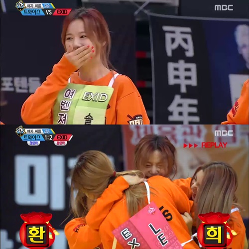 EXID는 10일 오후 방송된 MBC 설 특집 '아이돌 스타 육상 씨름 풋살 양궁 선수권 대회'에서 첫 출전한 트와이스를 2대1로 물리치고 여자 씨름 단체전 우승을 차지했다.