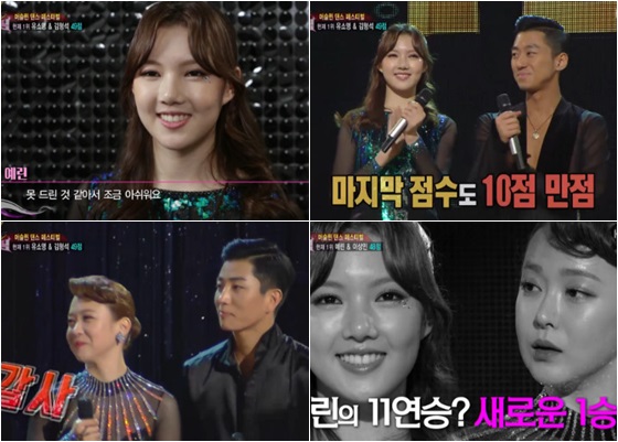 하지만 칼을 갈고 나온 유소영이 댄서 김형석과 완벽한 호흡을 보여주면서 새로운 1승을 기록했다. 승승장구하던 예린 팀의 11연승을 저지한 것. 우승을 눈앞에 두고 패한 예린은 "처음에는 긴가민가 했는데 우승자 자리가 좋았다. 아쉽긴 하다"며 "시원섭섭하다"고 소감을 밝혔다.
