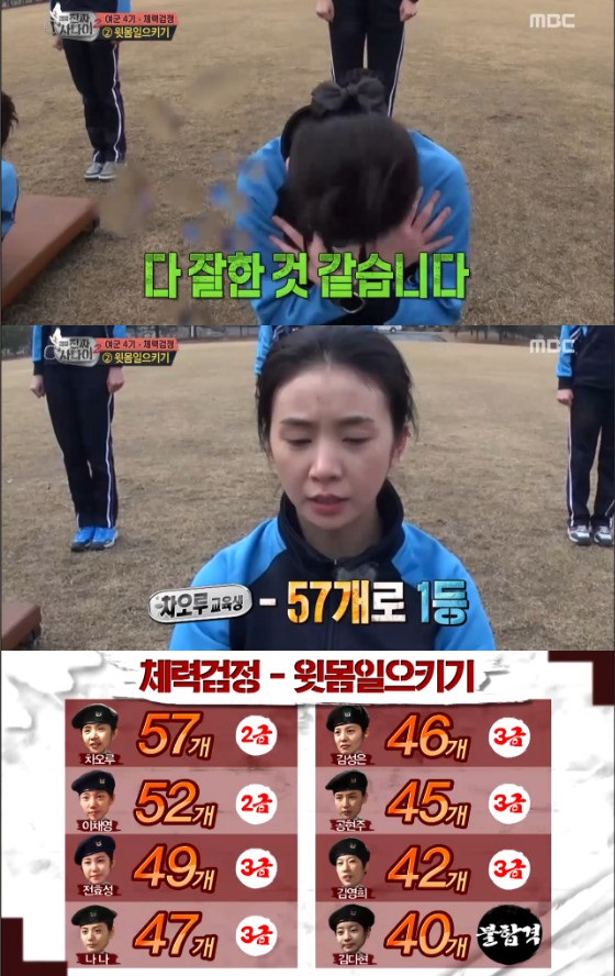 이날 방송에서 여군들은 체력검정의 첫 시작으로 팔굽혀펴기를 했다. 하지만 김영희를 제외한 나머지 멤버들은 한 번도 팔굽혀펴기를 하지 못했다. 담임교관은 "실망이다. 다들 실격이다"라며 이들을 자극했다.