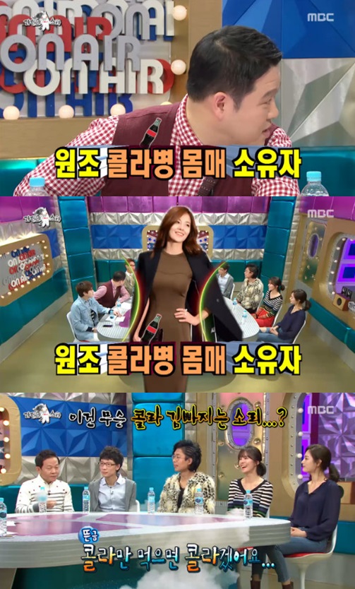 그런데 김국진이 "아니다. 얼굴 진짜 작고, 진짜 콜라병 몸매 원조다. 콜라 마시면 콜라되시겠다"라고 말해 웃음을 자아냈다.