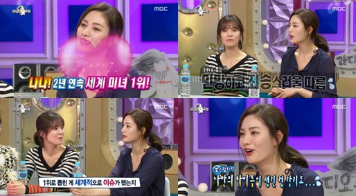 이날 방송에서 MC들은 한 블로거가 선정하는 세계 미녀 투표에서 2년 연속 1위를 하는 나나를 언급했다. 나나 이외에 수지, 송혜교, 유라, 혜리 등 후발주자들도 있었다.