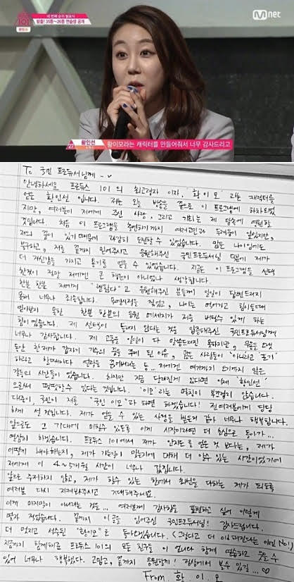Mnet '프로듀스 101'에서 '황이모'라는 캐릭터로 사랑을 받았던 황인선이 직접 쓴 손 편지로 감사의 마음을 밝혔다.