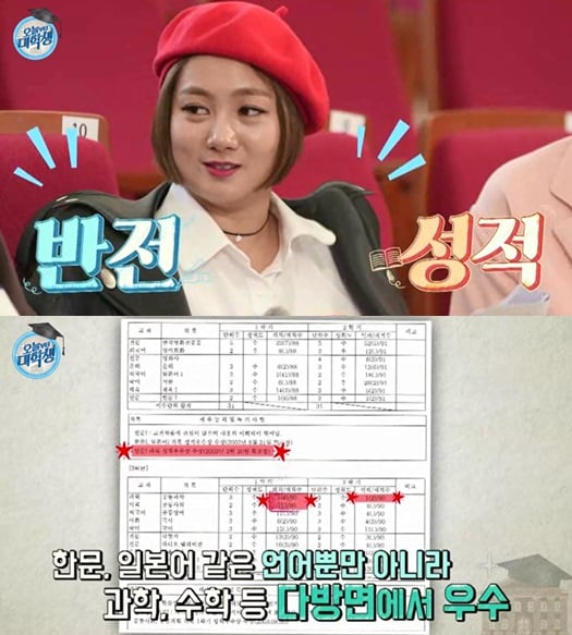그동안 MBC '무한도전', '라디오스타' 등 각종 예능 프로그램에 출연해 뇌순녀로 등극한 코믹 이미지와 달리 박나래의 성적표에는 올 수에 가까운 점수가 기록돼 있었다. 한문, 일본어는 성적우수상을 수상했고 공통과학과 실용수학에서는 전교 1등이라는 석차가 공개돼 모두를 놀라게 했다는 후문이다.