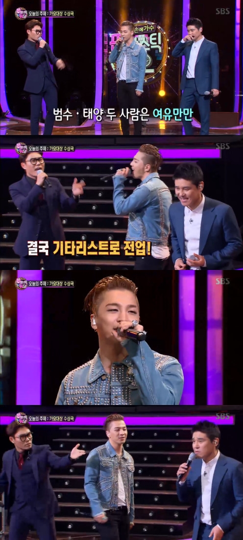 이날 임창정 다음으로 2014년 '눈, 코, 입'으로 대상을 받은 태양이 노래를 부르며 등장해 관객들을 환호하게 만들었다. 음악 예능 최초로 출연한 태양은 "사장님이 적극적으로 추천해 주셔서 나오게 됐다"고 말했다.