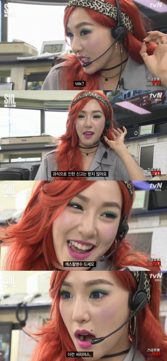 이어 '긴급출동 911'코너에서 티파니는 신고를 접수받는 미국인 직원으로 등장했다. 티파니는 껌을 씹으며 "과식으로 인한 신고는 받지 않는다"고 말해 웃음을 자아냈다.