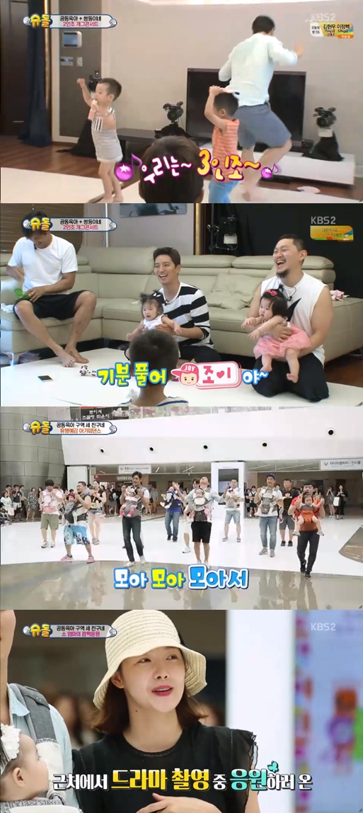 이휘재와 서언 서준 쌍둥이는 오지호 양동근 인교진 세 아빠의 공동경비구역에 찾았다. 서언 서준 쌍둥이는 아빠 이휘재를 닮은 끼를 여실히 뽐냈다. 서준이는 하은 조이 서흔이 앞에서 마빡이 흉내를 내며 순식간에 공동육아 구역을 개콘으로 만들었다. 서준이의 애교에 하은 조이 서흔이는 활짝 웃었다.