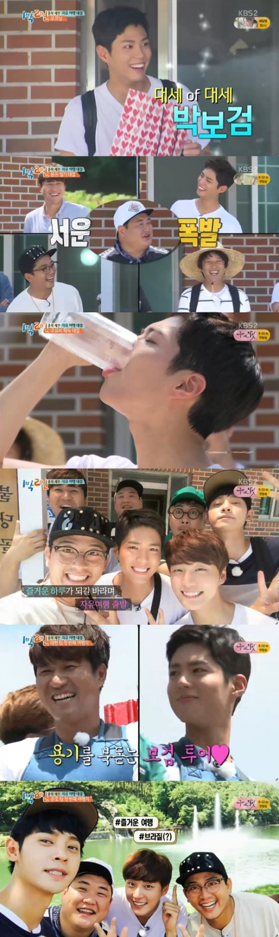'1박2일'에 배우 박보검과 개그맨 김준현이 등장해 예능감을 뽐냈다. 김종민은 박보검의 응원에 힘입어 공중 놀이기구에 도전했다.