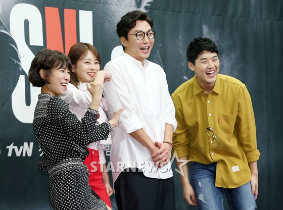 개그우먼 이세영, 이수민, 방송인 탁재훈, 배우 권혁수가 31일 오후 서울 마포구 스탠포드 호텔에서 진행된 tvN 'SNL코리아 시즌 8' 제작발표회에 참석해 포즈를 취하고 있다.