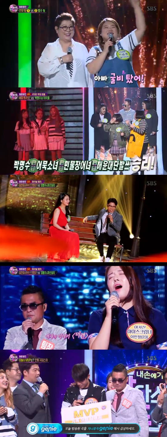 승자는 '미련'과 '빗 속의 여인'을 섞어 누구도 예상치 못한 무대를 보여준 김건모, 아차산 아이스크림녀 팀이었다. 이로써 김건모 팀은 2:3의 스코어로 김범수 팀에겐 졌지만 MVP 선택권을 가져가게 됐다.