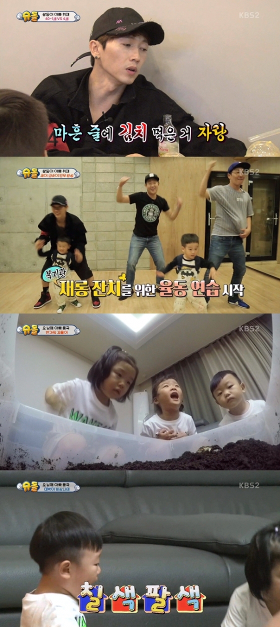 수아 설아 대박 삼남매는 장수풍뎅이를 만났다. 수아는 장수풍뎅이의 애벌레를 보고 '꼬물이'라는 이름을 붙여줬다. 겁없는 수아와 달리 설아는 애벌레가 손에 닿자 기겁을 하며 눈물을 터뜨렸다. 아이들에게 장난치는 재미가 들린 이동국은 바로 사과했다. 이동국인 설아에 이어 대박에게도 장난을 쳤다. 이동국은 "대박이에게 장난치는 것이 재밌다"며 장난기를 인증했다. 이동국의 계속된 장난에 대박은 뚜껑을 덮어버리는 것으로 응수했다.