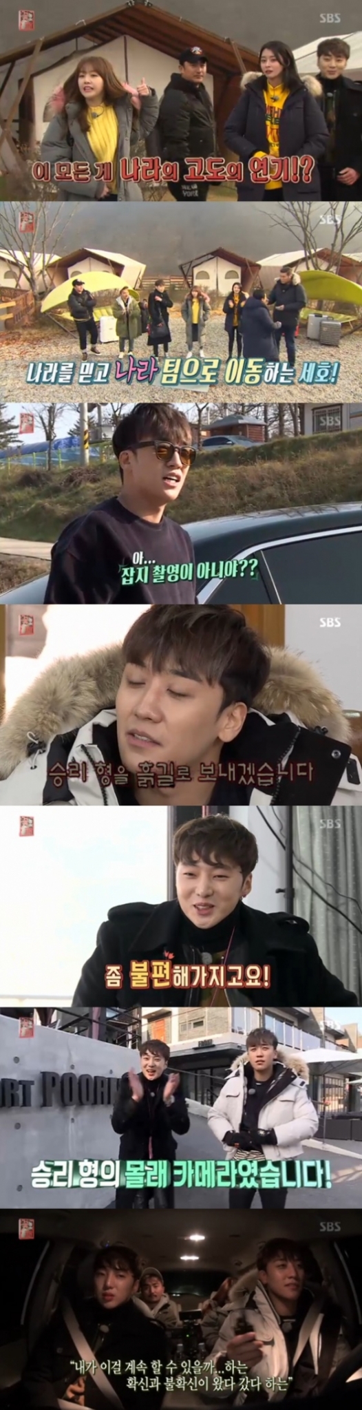 그런데 한 사람의 게스트가 더 있었다. 바로 그룹 빅뱅의 멤버 승리였다. 2년 만에 예능에 출연한 그는 일본 공연을 마치고 공항에서 바로 '꽃놀이패' 촬영장에 도착했다.