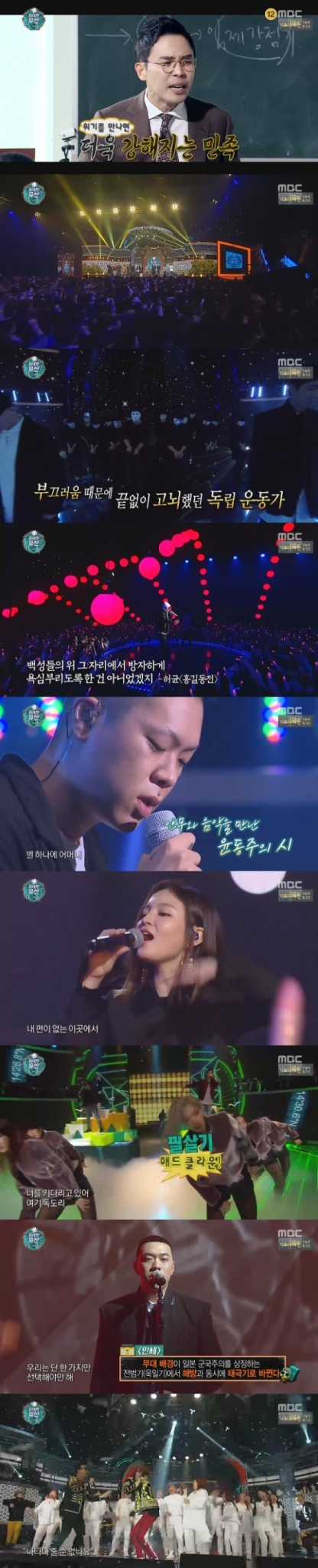 2개월의 대장정, '무한도전'의 '위대한 유산'이 드디어 베일을 벗었다. 출연자들의 애국심 담긴 열정과 칼군무를 비롯한 화려한 무대로 눈길을 사로잡은 것.