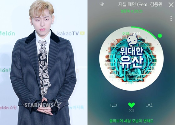 지코는 31일 자신의 인스타그램에 '무한도전-위대한유산'에서 정준하와 함께 부른 음원 '지칠때면' 음원 사진을 공개했다.