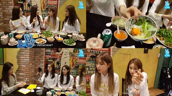 9일 오후 방영된 V앱 '[티아라] 효민 지연 은정 베트남 방문전 베트남 음식 먹방'에서는 그룹 티아라 멤버 큐리, 효민, 지연, 은정이 등장했다.