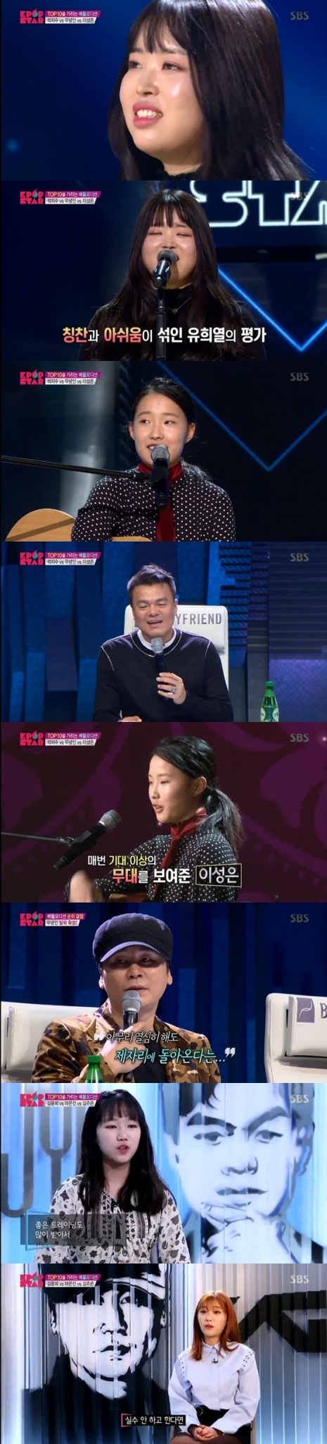 이성은은 아이유의 '스물셋'을 자신에게 맞게 '열다섯'으로 개사해 불렀다. 긴장해 주먹을 움켜쥐던 이성은은 뛰어난 기타 실력을 발휘해 무사히 무대를 마쳤다. 하지만 박진영은 "오늘 무대는 좀 아쉬웠어요"라고 평했다. 양현석도 이어서 "랩 가사처럼 빨라서 잘 안 들렸다"고 말해 아쉬운 평가를 남겼다. 유희열은 가르치는 동안 "생각이 너무 많았던 것 같다"며 자신의 잘못이라고 말한 후 "성은양의 재능은 아직까지 인정하고 있다"고 덧붙였다.