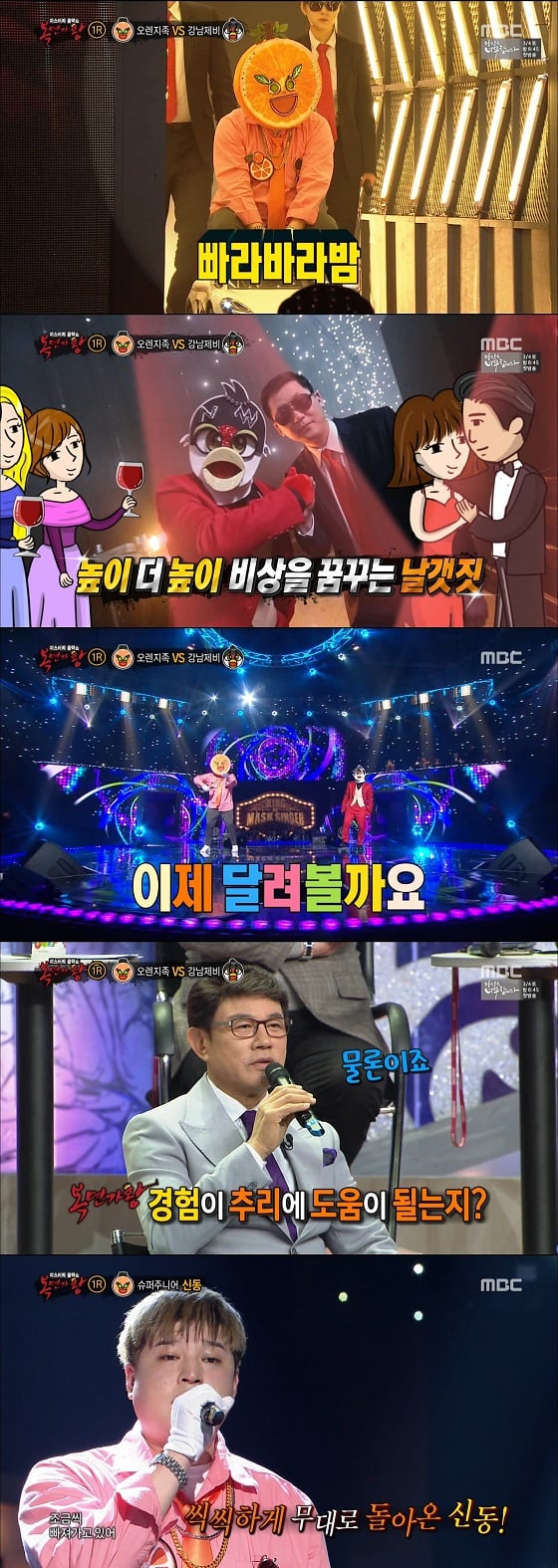'복면가왕' 첫 대결에서 '강남제비'가 2라운드 진출에 성공했다. 오렌지족은 슈퍼주니어 신동이었다.