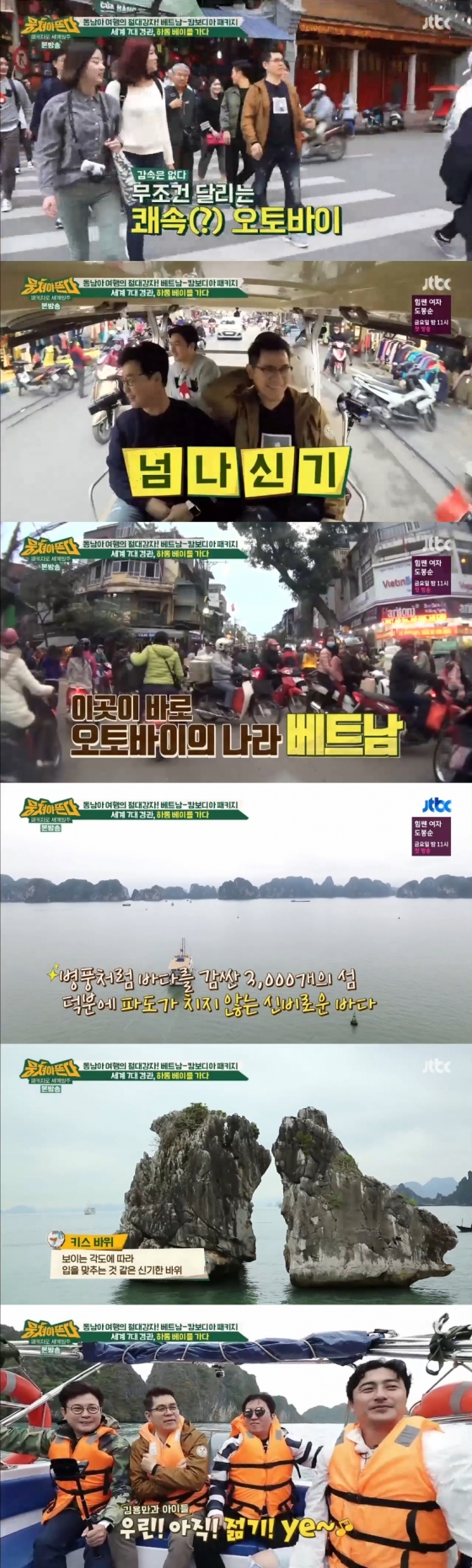 이후 네 사람은 하롱 베이의 섬 사이를 가로지르는 모터보트를 탔다. 패키지 여행의 모터보트 탑승은 빠른 속도로 하롱 베이의 섬 사이사이를 움직이며 브라운관에 멋진 경관을 선물했다.