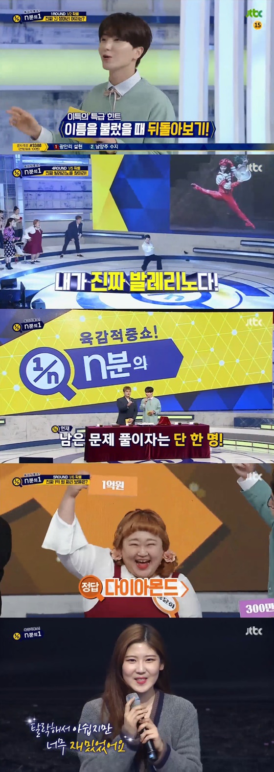7일 오후 방송된 JTBC 예능 프로그램 '육감적중쇼 n분의 1'은 총 6라운드를 거쳐 남은 인원들이 n분의 1로 누적 상금을 나눠가는 프로그램이다.