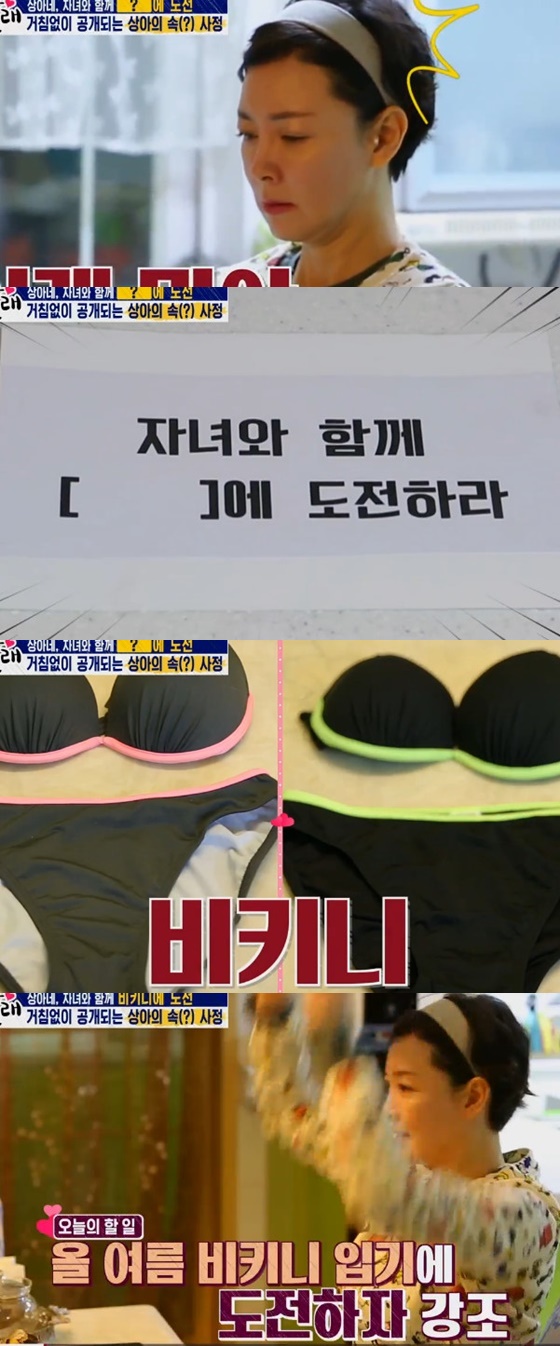 이날 이상아는 제작진에게 자녀와 함께 무엇인가 도전하라는 미션을 받았다. 미션지를 보며 곰곰이 생각하던 이상아는 이내 윤서진을 불러내 비키니를 보여주며 도전하자고 말했다.