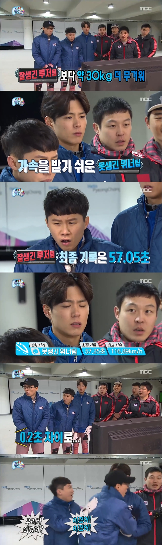 '잘생긴팀'은 '못생긴팀'보다 몸무게가 30kg 덜 나갔기에 가속도에서 불리했다. 또 '못생긴팀'은 2차 시기에서 탑승속도를 1초 이상 단축하며 큰 기대를 불러일으켰다. 그러나 최종 기록에서는 '잘생긴팀'에 비해 0.2초 늦었다. '잘생긴팀'은 '못생긴팀'에 비해 빠른 탑승속도로 불리함을 극복하며 승리를 거뒀다.