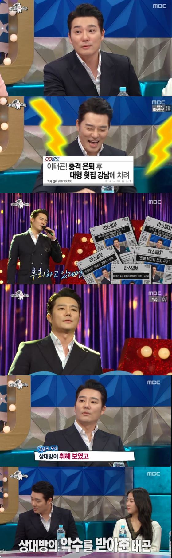 이태곤은 "쌍방 과실이 되기 때문에 반격하지 않았다"고 밝혔다. 그리고 폭행 시비 기사로 도배가 되고 은퇴까지 생각했었음을 털어놨다. 그는 "기사가 나오자마자 나는 회복 불가능이라고 생각했다"며 "그리고 횟집을 하려고 생각했었다"며 예상 밖의 답변으로 웃음을 자아냈다. 이태곤은 폭행 사건 후 모든 것을 내려놨었다며 거울을 보니 상처가 회복될 것 같지 않았다고 당시를 회상했다.