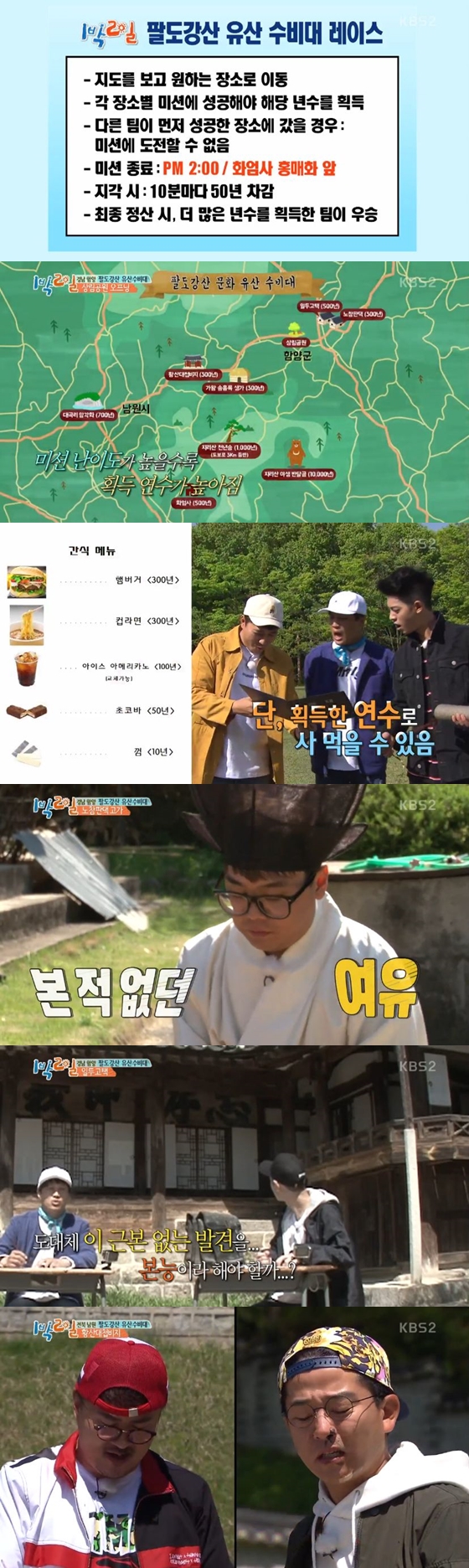 7일 방송된 KBS 2TV 예능프로그램 '해피선데이-1박2일 시즌3'에서는 '제 1회 팔도강산 유산수비대 레이스' 첫 번째 이야기가 그려졌다. 멤버들은 두 팀으로 나눠 점심 복불복을 위한 미션을 진행했다.