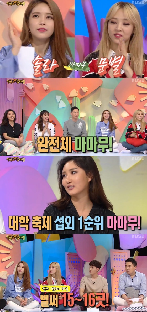 이날 마마무는 대학교 축제에 많이 섭외가 된다고 밝혔다. 솔라는 대학교 축제 섭외 수가 대략 16곳 정도 된다고 말해 주변을 놀라게 했다.