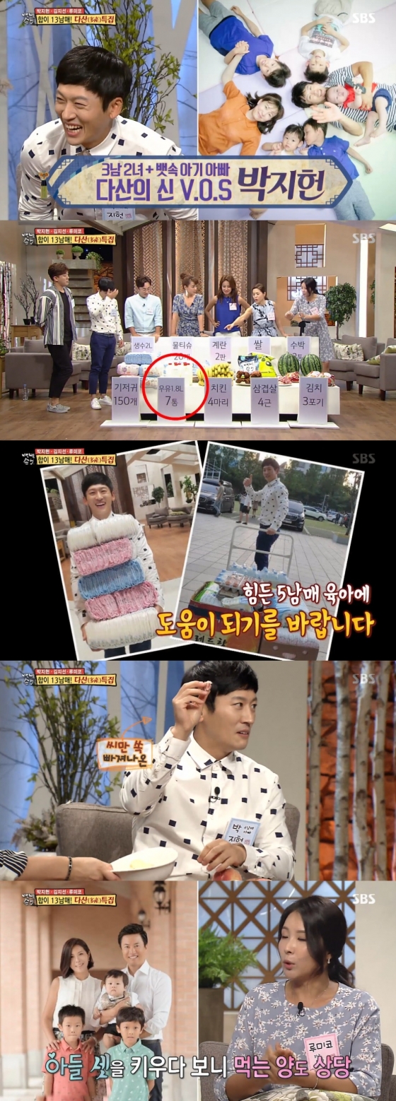 그는 6남매의 생활용품이 얼만큼 되는지 확인하기 위해 스튜디오에 일주일치 생활용품을 모두 모아와 공개하기도 했다. 많은 양의 생필품에 모두가 놀란 가운데 박지헌은 "기저귀는 아무 사이즈여도 된다. 왜냐하면 어떤 사이즈여도 쓸 아이가 다 있다"라고 말해 웃음을 줬다. 또 박지헌은 아이들이 많다 보니 과일을 빨리빨리 깎아야 한다며 과일 별로 껍질을 빨리 깎는 방법과 아이들 수에 맞춰 과일을 나누는 방법을 전수했다.