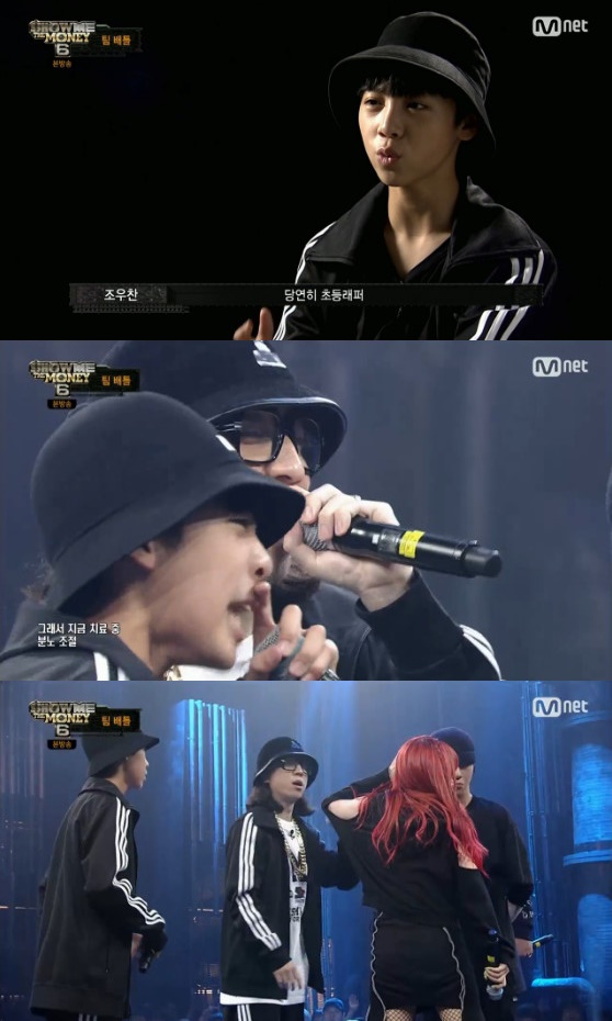 이날 조우찬은 '쇼미더머니6' 우승 후보로 꼽히고 있는 넉살과 한 팀이 돼 우원재, 에이솔을 상대했다. 먼저 에이솔과 우원재는 조우찬의 어린 나이를 활용한 랩을 선사했고, "우리 우찬이 많이 컸네", "우찬아 걱정 마 울어도 돼" 등의 가사로 공격했다. 넉살을 향한 공격 역시 강렬했다. 이에 조우찬은 우원재의 기에 전혀 눌리지 않았다. 또한 에이솔에게는 가사를 까먹은 것을 지적했다.