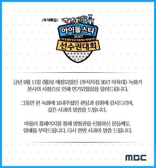 같은 날 MBC는 MBC 명절 예능 프로그램 '아이돌 육상 선수권대회'(이하 '아육대')의 녹화 연기를 공식적으로 알리며 또 사과했다.