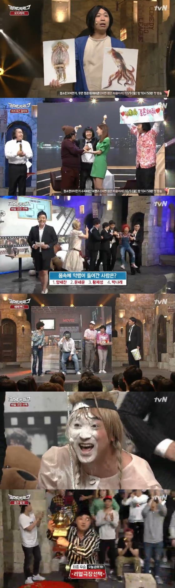 17일 오후 방송된 tvN 예능프로그램 '코미디 빅리그'의 3쿼터가 종료되고 1위가 공개됐다. 영광의 1위는 황제성 박나래 양세찬 문세윤 등이 활약한 '리얼 극장 선택'이었다.