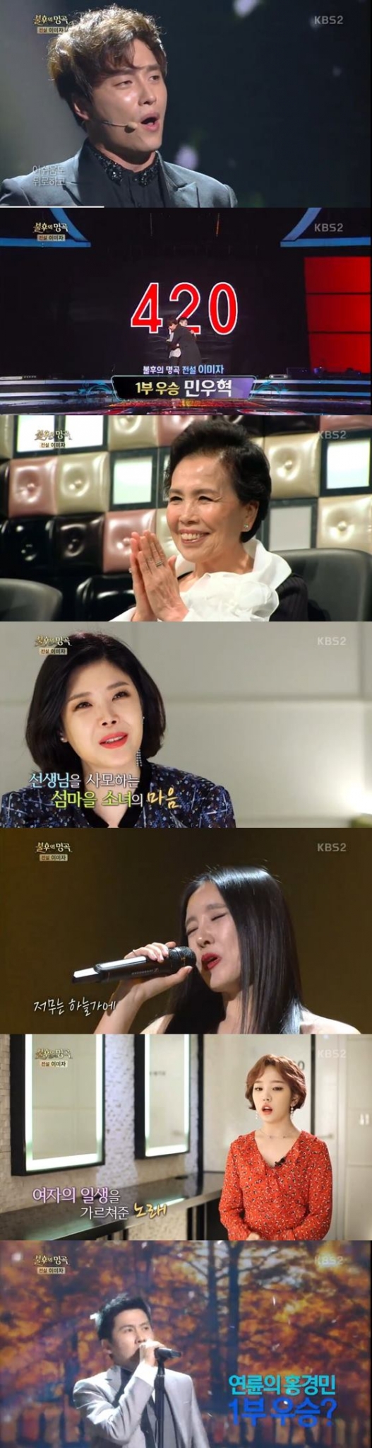 이날 '불후의 명곡-전설을 노래하다'에서는 이미자 편으로 꾸며졌으며 가수 민우혁이 1부 우승을 차지했다.