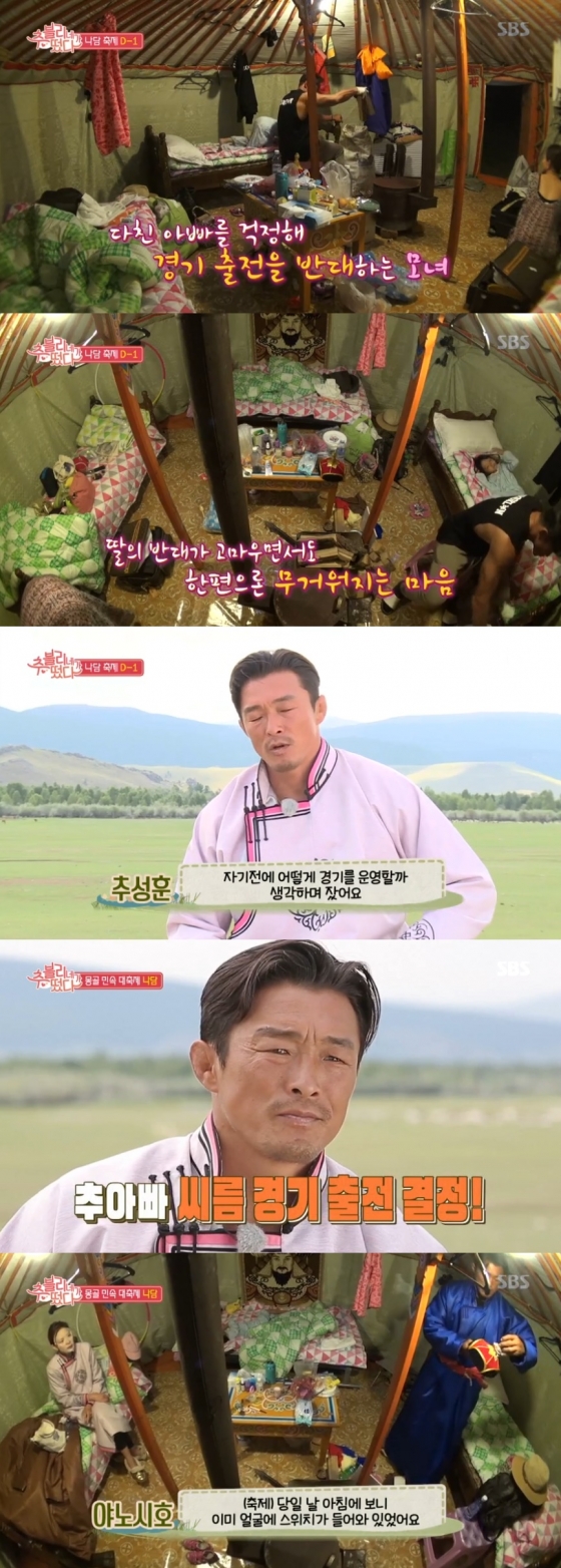 이날 방송에서 추성훈은 몽골 나담축제를 하루 앞두고 씨름 대회에 출전해도 될까하는 고민에 빠졌다. 몽골 씨름 선수들에게 유도 시범을 보이다가 허벅지에 부상을 입었기 때문이다.