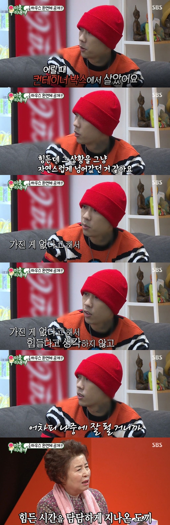 하지만 도끼가 처음부터 재력을 갖췄던 것은 아니었다. 딘딘이 도끼에게 "형도 어릴 때 힘들지 않았느냐"고 물었다. 도끼는 "어릴 때는 컨테이너 박스에서 살았다. 원래는 부모님께서 큰 레스토랑을 운영했다. 그런데 광우병 문제가 생기면서 3층 레스토랑이 쫄딱 망했다"고 털어놨다.