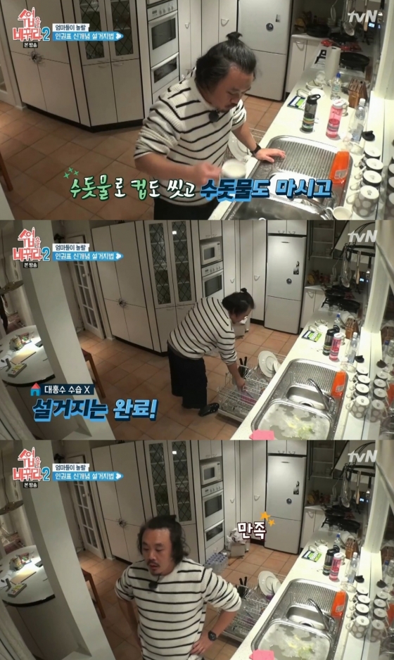 이날 김인권은 설거지를 해야하는 그릇을 모두 싱크대에 넣고 물에 담근 후 세제를 풀었다. 그 후 세제를 닦아내는 방식으로 설거지를 했다.