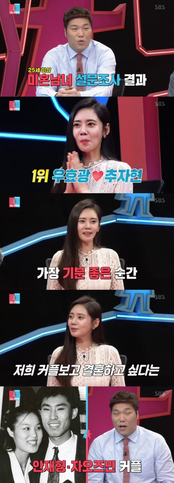 이날 방송에서 MC 서장훈은 "25세 이상 미혼 남녀를 대상으로 설문 조사한 결과 가장 부러운 연예인 부부 1위로 추자현, 우효광 커플이 뽑혔다"고 밝혔다.