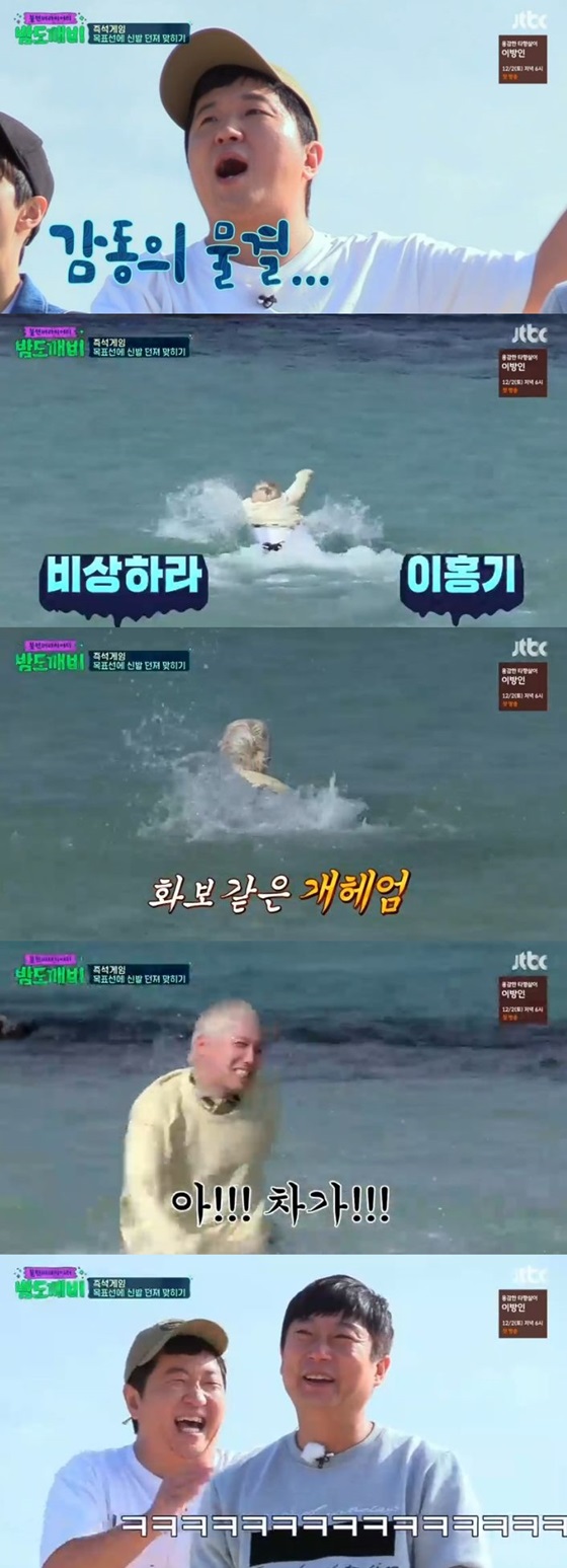 멤버들과 보아는 곽지해수욕장으로 이동했다. 이들은 역시나 벌칙이 걸려있는 게임에 시동을 걸었다. 멤버들은 해변에서 '신발 던지기' 게임을 했다. 불운의 아이콘 박성광과 공식 똥발인 아기깨비 김종현은 예상외의 선전을 보였다. 반면 이홍기는 자신있게 신발을 던졌지만 선을 완벽히 넘겨 입수를 확정 지었고, 제주도 바다에 시원하게 입수했다. 이홍기는 "아,차갑다!"를 외친 뒤 "옷이 너무 무거워졌다"며 짜증을 내기도 해 웃음을 자아냈다. 이어진 '공 굴리기' 게임에서도 이홍기는 또 입수에 당첨됐다. 볼링에 자신있던 이홍기는 '공 굴리기' 게임에서도 패해 허탈감을 보였고, 터덜거리며 입수했다.