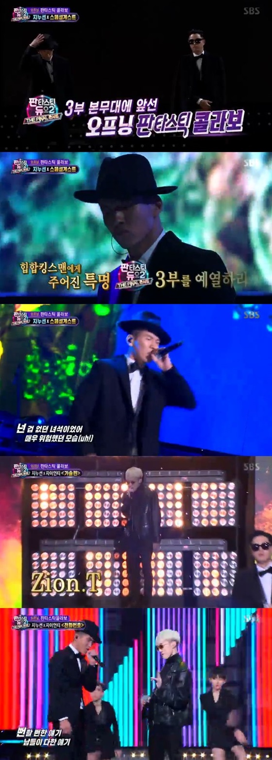 10일 오후 방송된 SBS 예능 프로그램 '판타스틱 듀오2'에서는 오프닝 무대로 가수 지누션과 자이언티가 합동 무대를 펼치는 모습이 공개됐다.