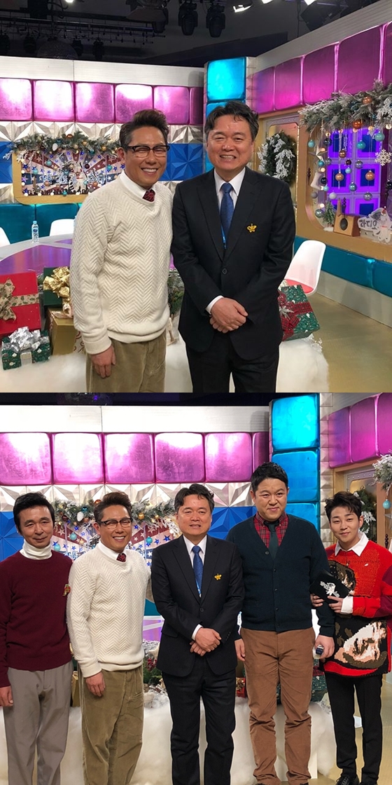 그가 공개한 사진에는 최승호 사장이 '라디오스타' 스튜디오를 방문해 MC들과 기념사진을 촬영한 모습이 담겼다. 최 사장은 긴장한 듯한 모습이었고, 두 손을 다소곳이 모으고 있다.